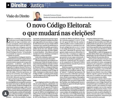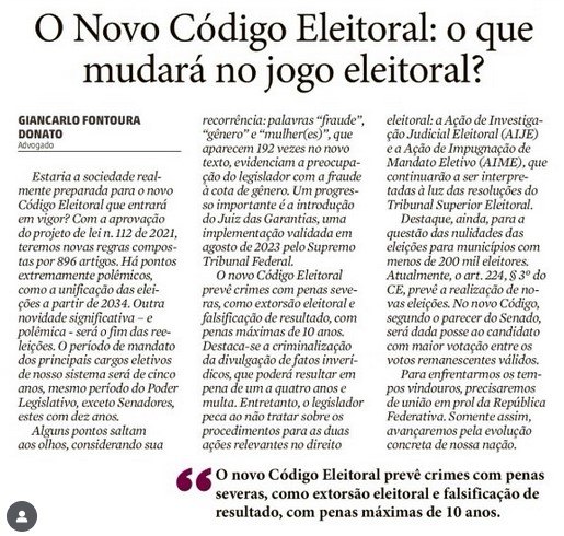 Estaria a sociedade realmente preparada para o novo Código Eleitoral que entrará em vigor? Com a aprovação do projeto de lei n.º 112 de 2021, teremos novas regras compostas por 896 artigos. Há pontos extremamente polêmicos, como a unificação das eleições a partir de 2034. Outra medida que gerará grande polêmica será o fim das reeleições — tanto para os cargos do Poder Executivo quanto para os cargos de direção dos principais partidos políticos.